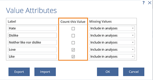 - Next, click the Value attributes button and only select the 2 Top Box categories in the Count this Value column.