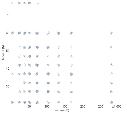 The scatterplot below shows age by income. This visualization exhibits a telltale sign of overplotting, which is that the data appears in neat rows and columns. There is no way to determine from this visualization if, say, there is only one person aged 60 with an income of $50,000 or more. The cause of the overplotting here is that the data has been collected in such a way that there are a small number of unique values (e.g., everybody aged 55 to 64 has been assigned a value of 60).