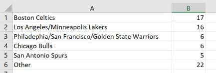 The most common approach for creating a a pie chart in Excel is to first setup your data in a basic table. Make sure that your first column contains the labels and your second, the values. For this example, we’re going to create a pie chart based on the number of NBA Championships won by each team. Since there are 30 teams in the NBA, we’ll focus on those that have won a minimum of 5 championships and group the others into an “Other” category. Here is what our data looks like: