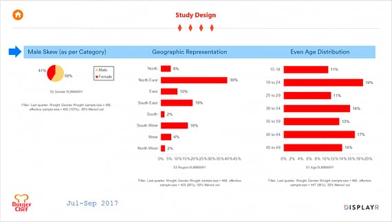 Sometime later I get some new data and update my Displayr document. I then update the PowerPoint, including the example slide above. You can see below the data has updated (to Oct – Dec 2017), but while the chart headings are centered, the edits to text and font styles have been over-written.