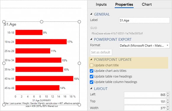 We’ve recently added to this with the POWERPOINT UPDATE feature. This allows users even more control over which elements of charts or tables to update or not. A user may make some changes to chart or axes titles when editing their PowerPoint. If there is a need to update the PowerPoint from Displayr later, they can adjust the Displayr settings (object by object) to preserve these specific edits.
