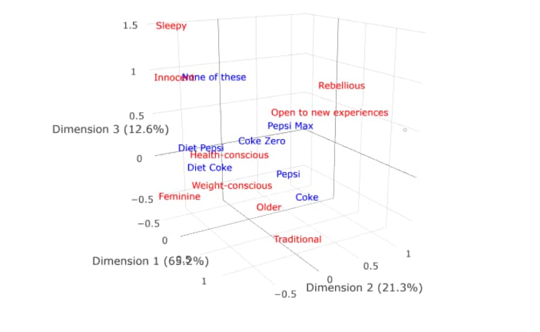 Traditional correspondence analysis plots typically plot the first two dimensions of a correspondence analysis. Sometimes, additional insight can be gained by plotting the first three dimension. Displayr makes it easy to create three-dimensional correspondence analysis plots.