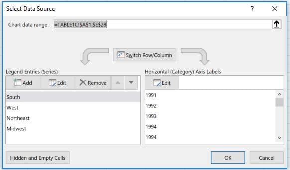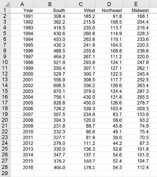 The easiest way to create an area chart in Excel is to first set up your data as a table. The first column should contain the labels, and the second column contains the values. To create a stacked area chart where the values are split into sub-groups, create a column for each of the sub-groups. In this example, we’ll use a data set that shows annual building permits by region for single-unit homes in the US from 1991 through 2016. The following data set shows total permits issued (in thousands) for each region by year. The first column contains the y-axis label (year) with a column for each region. The values in the table represent the number of permits.