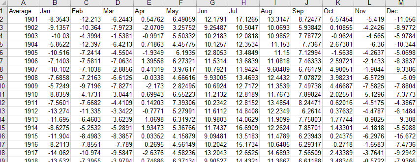 So far so good, but this only allows me to see a part of the picture. I want to see the whole time period between 1901 and 2015. To do that, I'll change the column and row sizes so that I can fit more onto my screen. First up, let's get rid of some of these decimal places: they don't add anything to my story. Select all the cells in the table, then click the Home > Number > Decrease Decimal button a few times, until only the whole numbers remain.