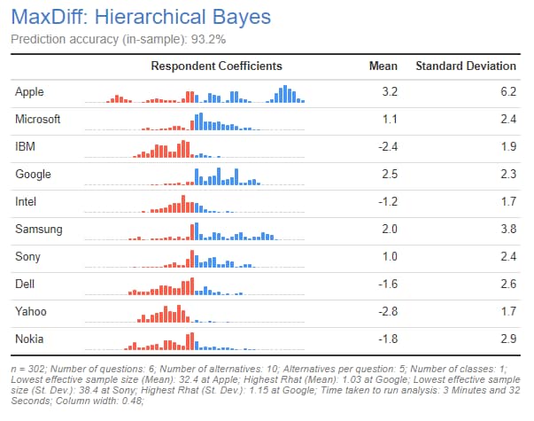 The output of Hierarchical Bayes is a table with histograms showing the distribution of respondent coefficients. In the next few sections I describe other types of outputs created from the Insert > More > Marketing > MaxDiff > Diagnostic menu. The coefficients are scaled to have a mean of 0 across brands (i.e., the brand with the highest mean, in this case, Apple, is the most preferred brand). We can also see that some people like it less than average (which is shown by the proportion of the histogram in red). Apple is the most divisive brand, resulting in a wide range of coefficients. In contrast, a majority of respondents have a mildly positive view of Google and not many dislike it.