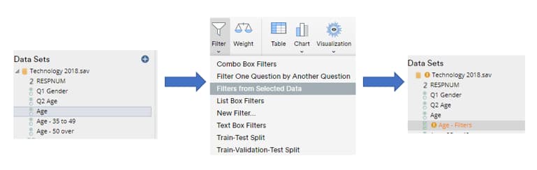 The simplest way to bring additional variables into play is by filtering the data. This restricts the analysis to a subset of the available data. Any table created by dragging and dropping from Data Sets can be filtered. To create filters in Displayr, select the data that you wish to use under Data Sets (e.g., hold down the Ctrl key on your keyboard and select the data from the bottom-left of the screen), and select Insert > Filter > Filters from Selected Data.