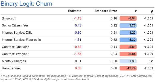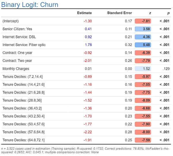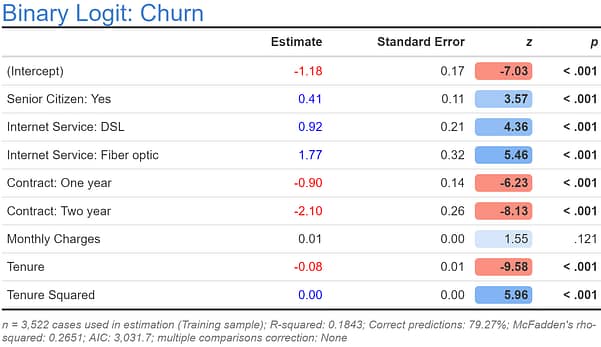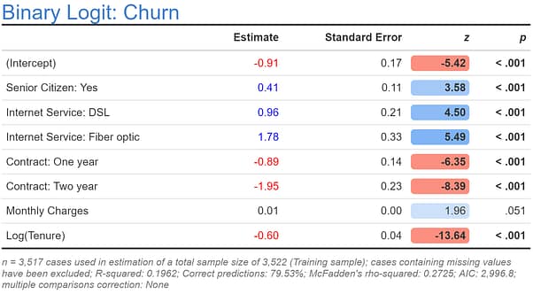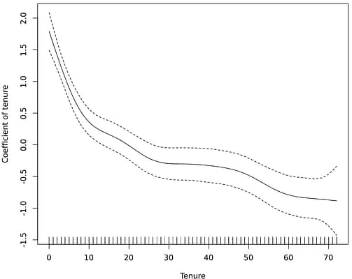 The way that we read this is that the tenures are shown on the x-axis, and we can look up the coefficient (effect) for each of these. We can see, for example, that the coefficient is about 1.75 for a tenure of 0 months, but this drops quickly to around 0.4 after 10 months, after which the drop-off rate declines, and declines again at around 24 months. Although the spline is very cool and can detect things that have not been detected by any of the other models, the model’s resulting AIC is 3,012, which is not as good as the logarithmic model, suggesting that the various wiggles in the plot reflect over-fitting rather than insight.