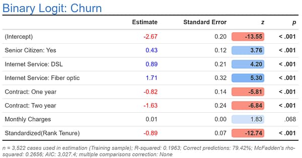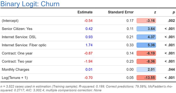 The simplest way of transforming a numeric variable is to replace its input variables with their ranks (e.g., replacing 1.32, 1.34, 1.22 with 2, 3, 1). The rationale for doing this is to limit the effect of outliers in the analysis. If using R, Q, or Displayr, the code for transformation is rank(x), where x is the name of the original variable. The output below shows a revised model where Tenure has been replaced by Rank Tenure. If we look at the AIC for the new model it is 3,027.4, which is lower (which means better) than for the original model, telling us that the rank variable is a better variable. However, we have a practical problem which is that the estimated coefficient is 0.00. This is a rounding problem, so one solution is to look at more decimal places. However, a better solution is to transform the predictor so that it does not provide such a small estimate (this is desirable because computers can make rounding errors when working with numbers very close to 0, as can humans when looking at such numbers).