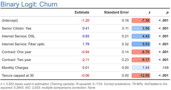 The output from the model with tenure capped at 30 is shown above. The model is better than our initial model, but not as good as any of the more recent models. The reason why it performs better than the original model can be understood by looking at its coefficient of -0.06, which is twice the coefficient of the first model (-0.03), which tells us that the effect of tenure is comparatively greater for the lower values of tenure (as hypothesized in the discussion of logarithms).