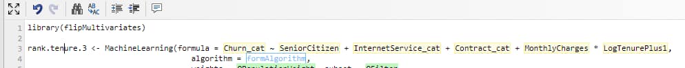 An interaction is a new variable that is created by multiplying together two or more other variables. For example, we can interact tenure and monthly charges by creating a new numeric variable with the code Tenure * `Monthly Charges`. Note that in this example, backticks (which on an international keyboard is the key above the Tab key) surround monthly charges, which is the way to refer to variables in Displayr by their label rather than their name.