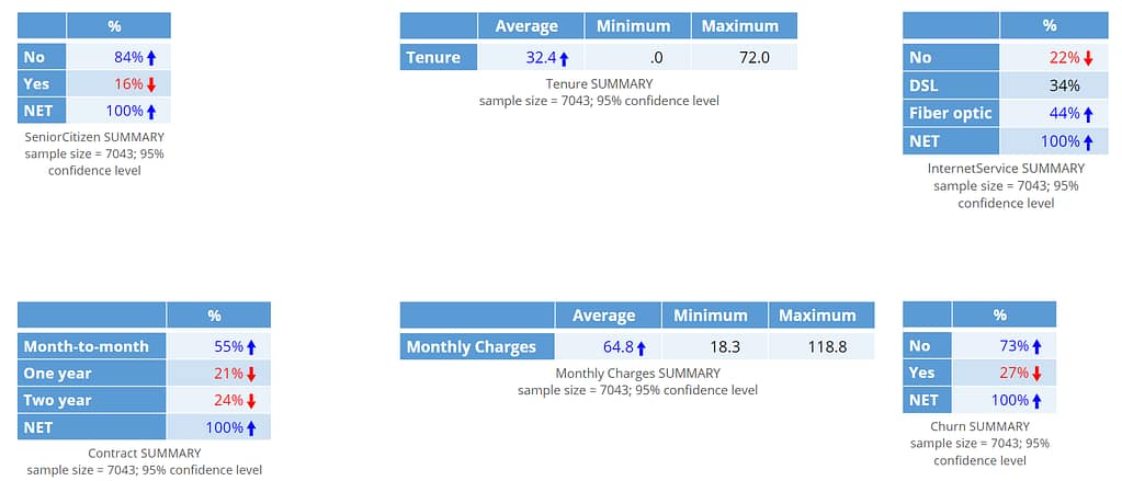 - Selected the Tenure and Monthly Charges tables, and then, in the Object Inspector, clicked Statistics > Cells and clicked on Maximum and then Minimum, which adds these statistics to the table. In order to read them, click on the two tables that are on top, and drag them to the right so that they do not overlap. The good thing to note about both of these tables is that the averages, minimum, and maximum all look sensible, so there is no need to do any further data checking or cleaning.
