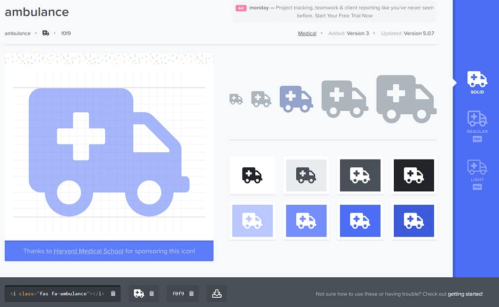 To choose an icon, go to Font Awesome’s gallery of free icons and search for the icon you like and click on it. The screenshot below shows the ambulance, for example. Then, copy the HTML at the bottom-left (in this case it is <i class=”fas fa-ambulance”></i>).