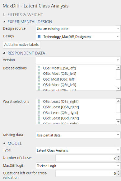 - Add the latent class analysis to your project by selecting Insert > More > Marketing > MaxDiff > Latent Class Analysis.