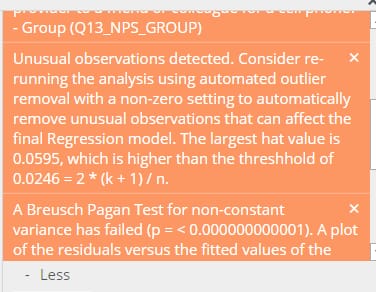 In Displayr and Q various standard techniques are used to see if there are any rogue observations. If detected, they appear as warnings, like the one shown below. If new to statistics, the warnings can be a bit scary at first. Sorry! But, do take the time to process them, once you get over the scariness, you will grow to appreciate that they are structured in a useful way.