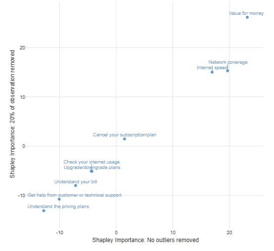As an example, the scatterplot below shows the importance scores estimated for two Shapley Regressions, one based on the entire data set, and another based on 20% of observations being removed. With both regressions there are warnings regarding influential observations. However, we can see that while there are differences between the conclusions of the models (the estimated importance scores would be in a perfectly straight line otherwise), the differences are, in the overall scheme of things trivial and irrelevant, giving us some confidence that we can ignore the outliers and use the model without any outlier removal.