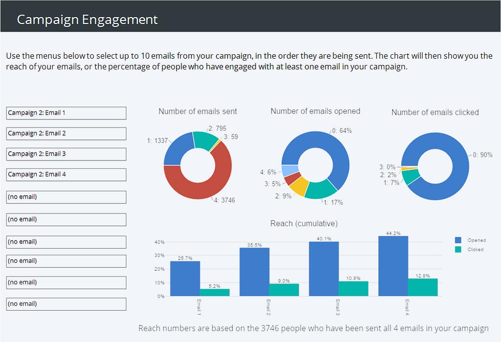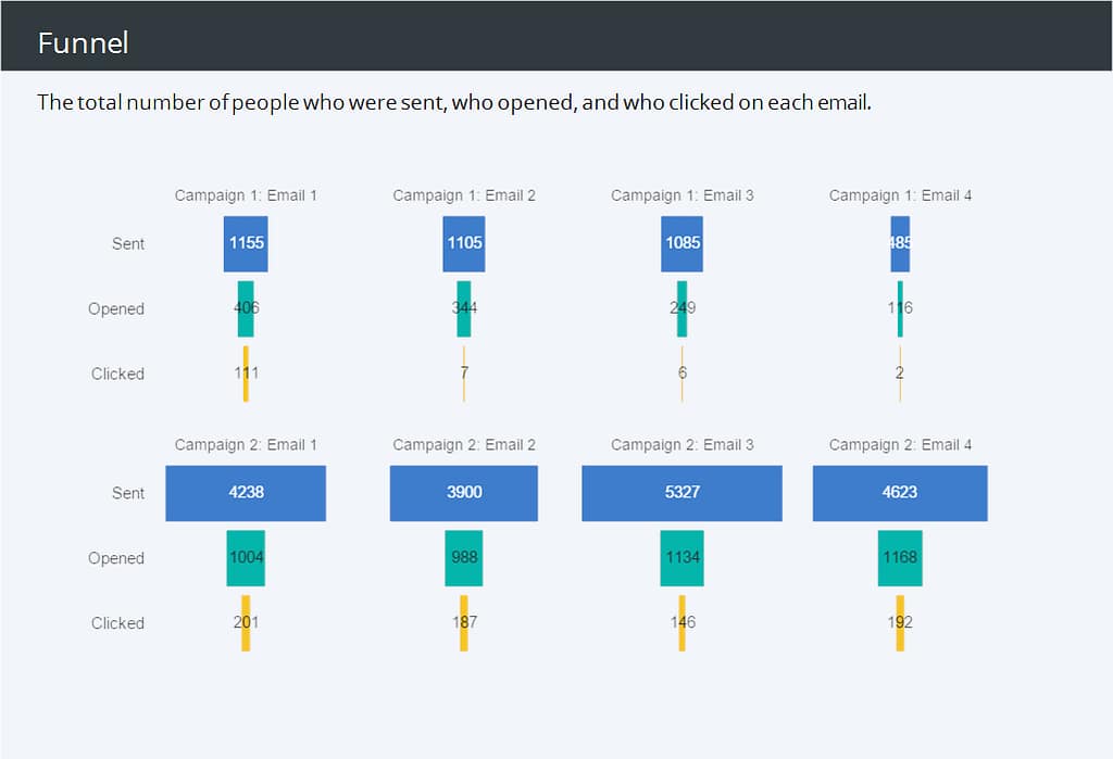 So, you’ve created the perfect user onboarding email sequence. Congratulations! Now what? Now, it’s time to see how well it’s doing! There are many, many metrics you could track, but we focus on a few key measures that will help reveal what’s going on. Namely: number of emails sent, open and click rates, and total campaign engagement. To track these measures, we created our email tracking template. This dashboard visualizes all your email campaigns, allowing you to see at a glance how they’re doing.