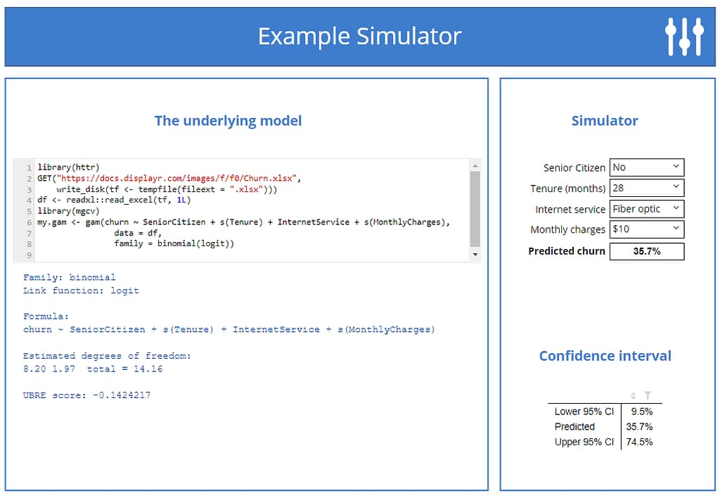 Correctly interpreting predictive models can be tricky. One solution to this problem is to create interactive simulators, where users can manipulate the predictor variables and see how the predictions change. This post describes a simple approach for creating online interactive simulators. It works for any model where there is a predict method. Better yet, if the model’s not top secret, you can build and share the model for no cost, using the free version of Displayr!