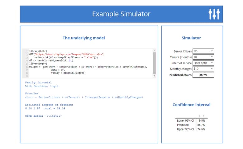 Correctly interpreting predictive models can be tricky. One solution to this problem is to create interactive simulators, where users can manipulate the predictor variables and see how the predictions change. This post describes a simple approach for creating online interactive simulators. It works for any model where there is a predict method. Better yet, if the model’s not top secret, you can build and share the model for no cost, using the free version of Displayr!