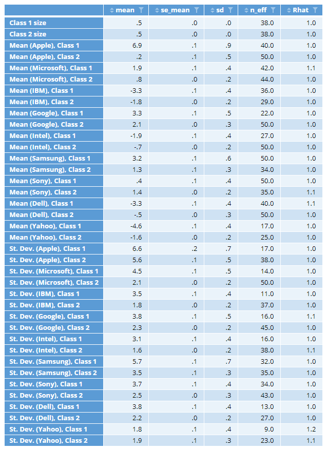 This table includes statistics for the class sizes, estimated means and standard deviations. The off-diagonal covariance parameters are not shown due to the lack of space, and because they are not as important. n_eff is an estimate of the effective sample size (samples of the parameters, not cases). The smaller n_eff, the greater the uncertainty associated with the corresponding parameter. Thus, in the table above, we can see that all the sigma parameters (the standard deviations) tend to have more uncertainty associated with them than the means (this is typical).