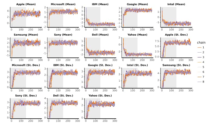 Trace plots show the parameter samples for each chain. The plots below are for means and standard deviations from an example with 500 iterations and 2 chains. The grey halves indicate the warm-up iterations, whereas the second halves of each plot contain the samples that are used to compute the final result. The following are features to look out for that would indicate an issue with the sampling:
