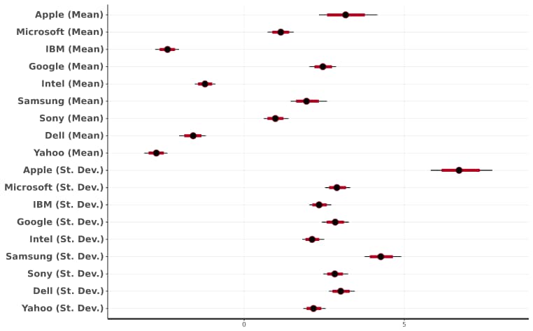 Posterior interval plots show the range of the sampled parameters. The black dot corresponds to the median, while the red line represents the 80% interval, and the thin black line is the 95% interval. There is nothing out of the ordinary in this plot, but I would be concerned if intervals were wide or if the median was off-center.