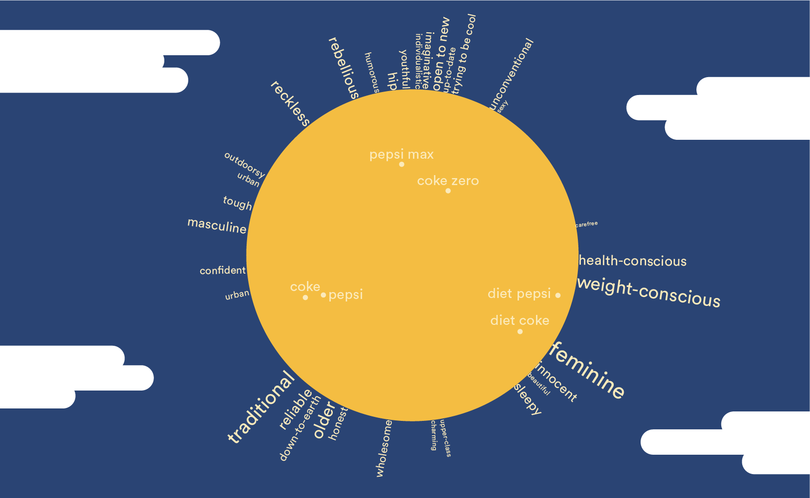 - Most importantly, the obvious interpretation of this map is correct in terms of the brand associations. For example, it is clear on this map that Diet Pepsi is associated with Feminine, Innocent, Sleepy, Weight-conscious, and Health-conscious. The user can work this out by glancing at the map, with no need for rulers, protractors, nor an understanding of the dot product.