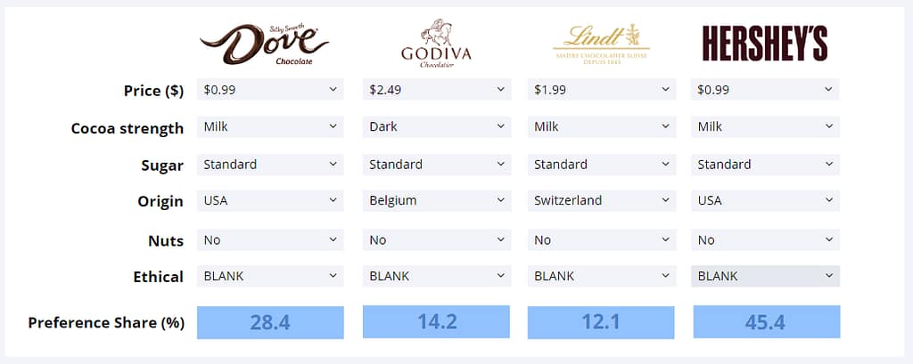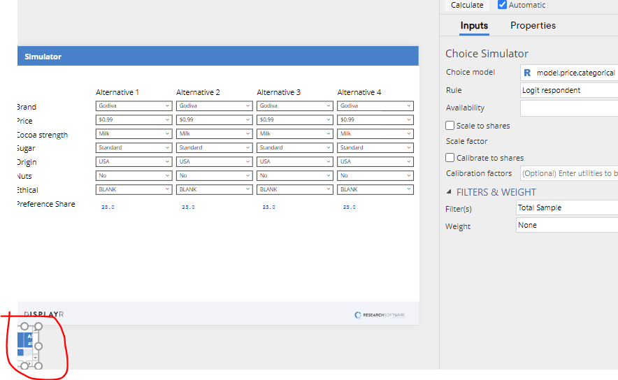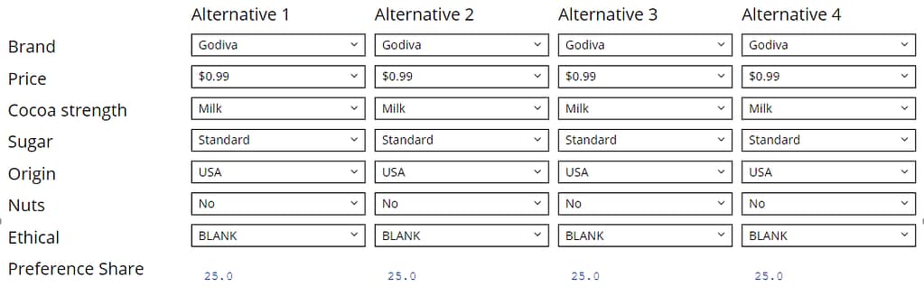 If attributes have been analyzed as numeric (see Numeric Attributes in Choice-Based Conjoint Analysis in Displayr), when the simulator is created the combo box for the attribute will show the minimum value of the attribute used in the research, the maximum value, and two equally-spaced points in-between. For example, if the research has tested prices of $0.99 and $2.49, the combo box will contain options of 0.99, 1.36, 1.74, 2.49.