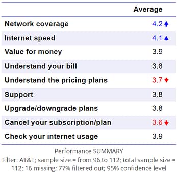 The first step is to create a table that shows the performance by attribute, such as the table shown below. In this example, I simply dragged the Performance variable set (structured as a Numeric-Multi) from the Data Sources tree to the page to create a summary table automatically. I then filtered it by those respondents whose phone carrier is AT&T. You can also paste or import a table of data similar to below in Displayr directly.