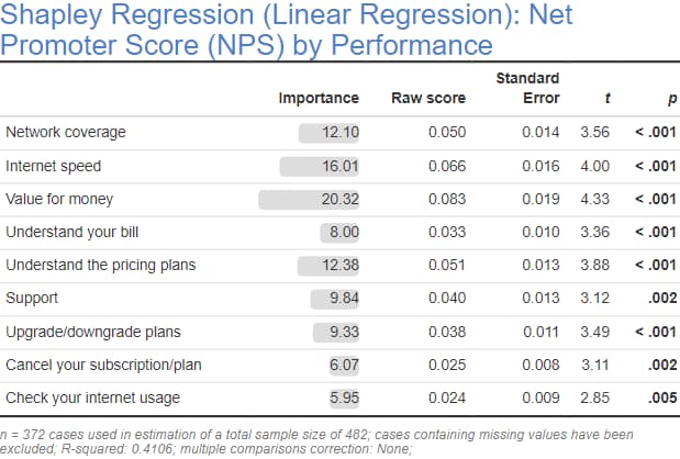 The next step is to create a table showing the importance of the drivers. This table can either be a traditional table, or, the results of a regression or driver analysis. The example below is from a Shapley Regression, see How to Run and Interpret Shapley Regression in the Displayr Help Center for more detail. You can also paste or import a table similar to Step 1 above directly into Displayr, but this time showing the importance scores.