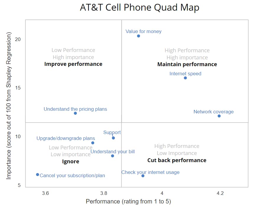 A quad map is market research jargon for a scatterplot which shows a series of attributes in terms of their importance to the market and the performance of one or more brands on these attributes. The example below is for AT&T in the US Cell Phone market. The horizontal axis shows the performance of AT&T, based on ratings out of 5 by its customers. The vertical axis shows the importance of these attributes, computed using driver analysis (Shapley Regression). The term “quad” comes from the two-by-two matrix placed over the scatterplot, which explains the implication of of quad map. You may also be familiar with these types of charts being called a matrix diagram.