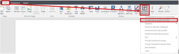 - Insert > Dimension Reduction > Correspondence Analysis of a Table.