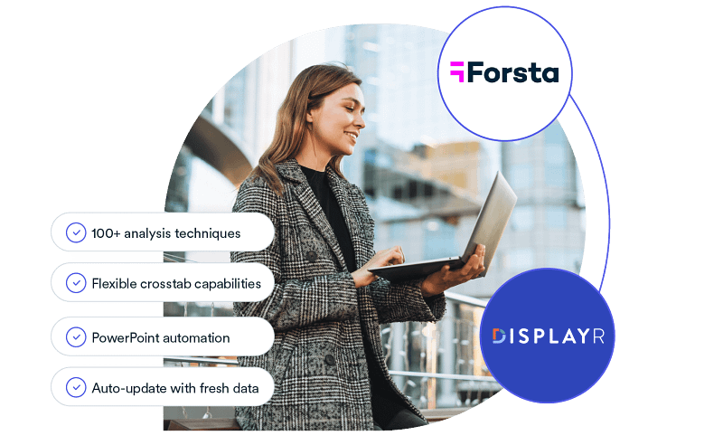 This is why integrating Forsta with Displayr makes perfect sense. When researchers are under pressure to deliver high-quality insights but time frames are short, the Forsta and Displayr partnership has got you covered. Now you can benefit from more profound, more sophisticated analyses, flexible crosstabbing tools, rapid PowerPoint reporting, and automatic updates with new data.
