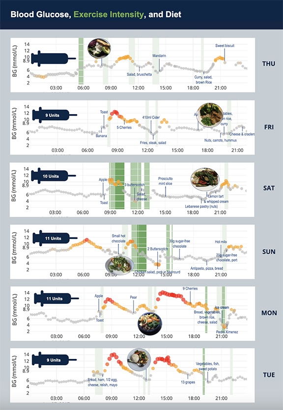 This dashboard shows a fun and innovative way to track blood glucose levels and food intake. Here we’ve integrated data from a wearable blood glucose implant and a food diary, providing a comprehensive view of this person’s health and wellness. The underlying charts are fully automated, making tracking progress and identifying trends over time easy.