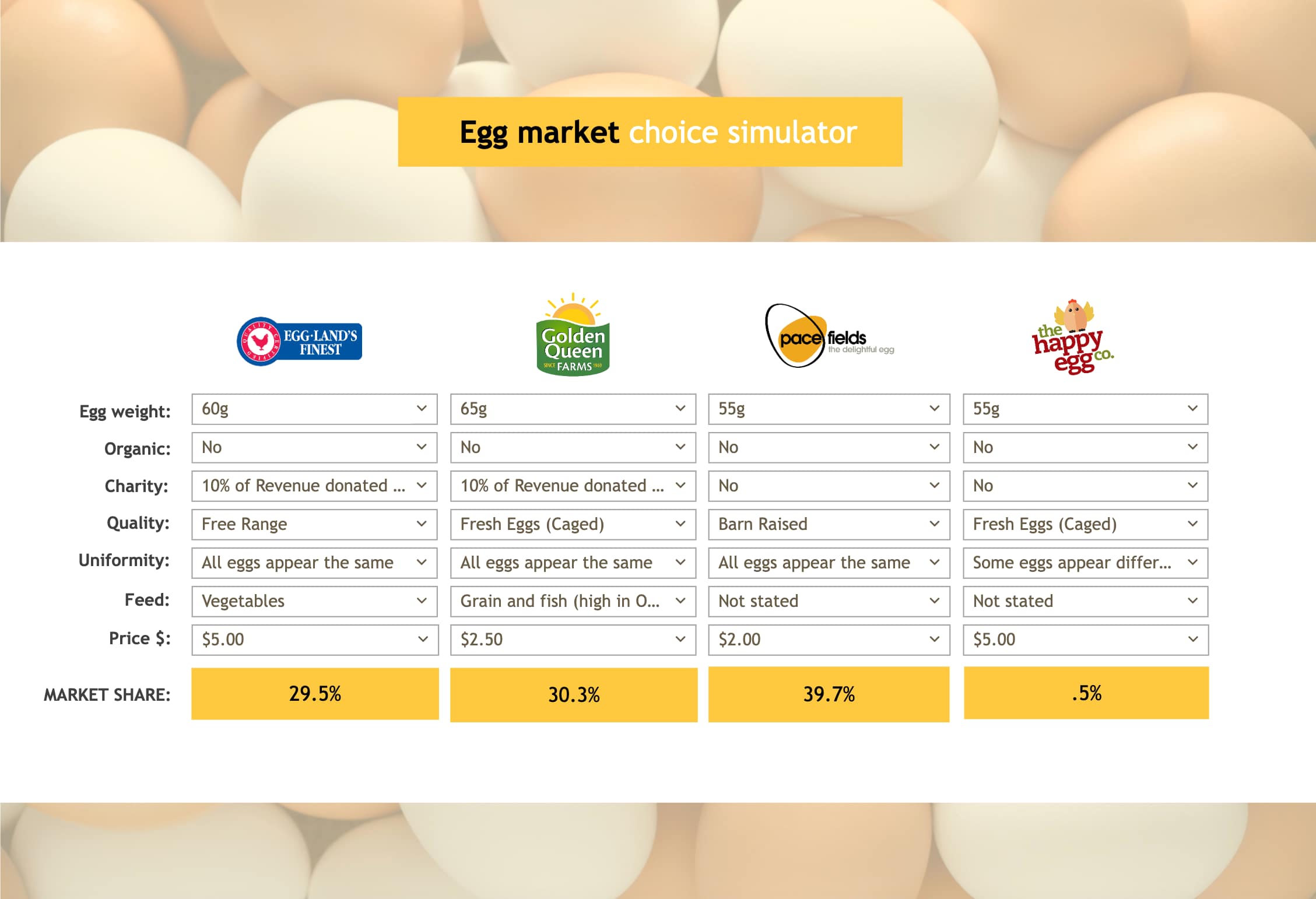 This simulator dashboard example is from a latent class logit choice model of the egg market. The user can select different properties for each of the competitors from the dropdown menus and the dashboard predicts market share.