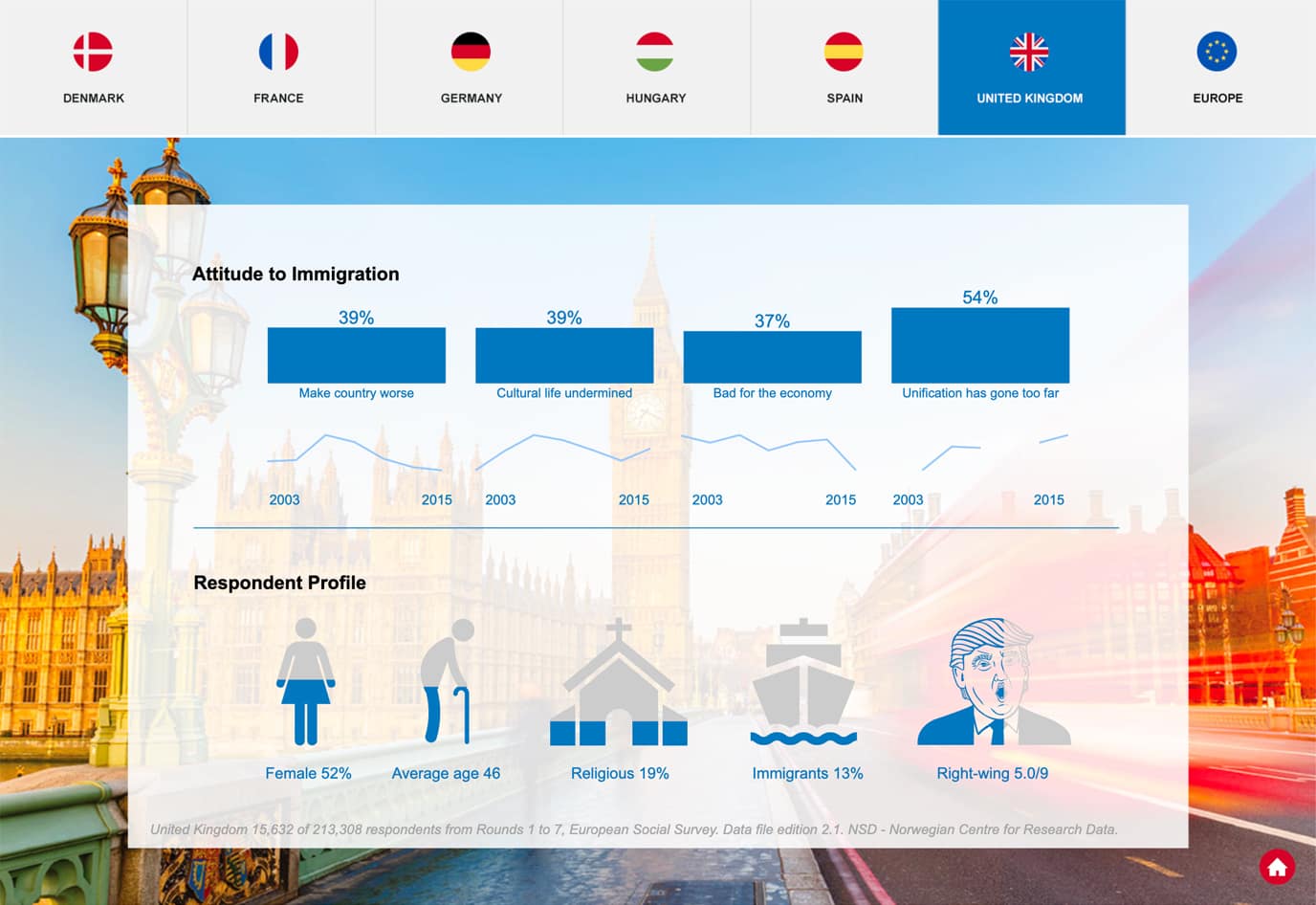 The dashboard below has a menu represented by flags. Each flag hyperlinks to information about the relevant countries. It reads from a very large sample and also has filters to further drill down in to demographic behavior.