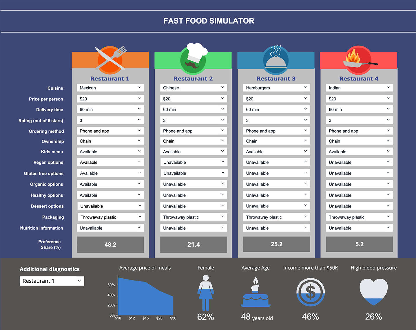 Powered by choice-based conjoint analysis, this fast food simulator allows you to experiment with different options and see how they stack up against each other.