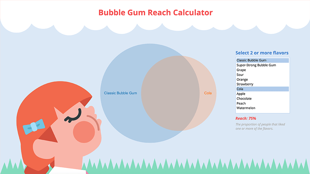 This interactive dashboard lets you experiment with different bubble gum flavors and see how they affect your reach. With a TURF analysis at its core, the Bubble Gum Reach Calculator uses cutting-edge techniques to help you maximize your market share and penetration with the most delicious and exciting flavors.
