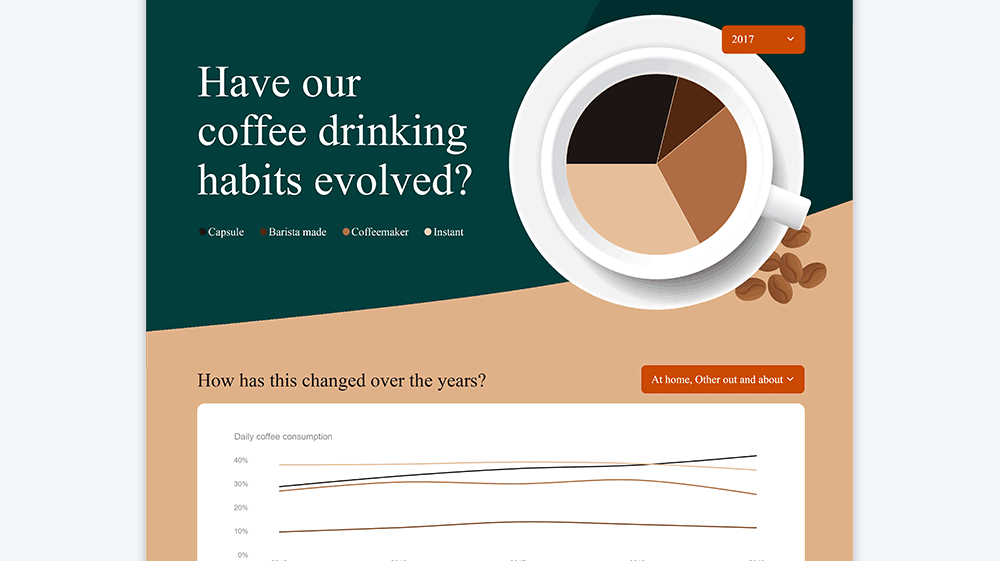 This dashboard tells a great story about coffee market trends, the rise of capsules, and how one brand is driving this change. And one of the best parts? It’s dynamic – you can change the focus year or where coffee is consumed and visualizations and even text labels all update.