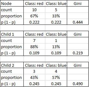The initial node contains 10 red and 5 blue cases and has a Gini impurity of 0.444. The child nodes have Gini impurities of 0.219 and 0.490. Their weighted sum is (0.219 * 8 + 0.490 * 7) / 15 = 0.345. Because this is lower than 0.444, the split is an improvement.
