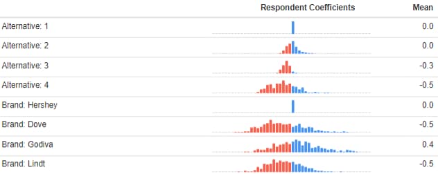 Looking at the averages for the four brands, again the first brand has been pegged at 0 for all respondents, and the other results are relative to this. We can see that the means for Dove and Lindt are less than 0, so they are on average less preferred than Hershey (all else being equal), whereas Godiva has a higher average preference. For each of the brands there is quite a lot of variation (fortunately a lot more than for the alternative), suggesting that people differ a lot in their preferences.
