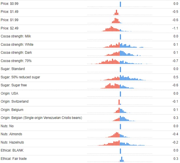 A basic metric for any choice model is its predictive accuracy. The chocolate study has a predictive accuracy of 99.4% after removing the respondents with poor data. This sounds too good to be true, and it is too good. This predictive accuracy is computed by checking to see how well the model predicts the data used to fit the model.