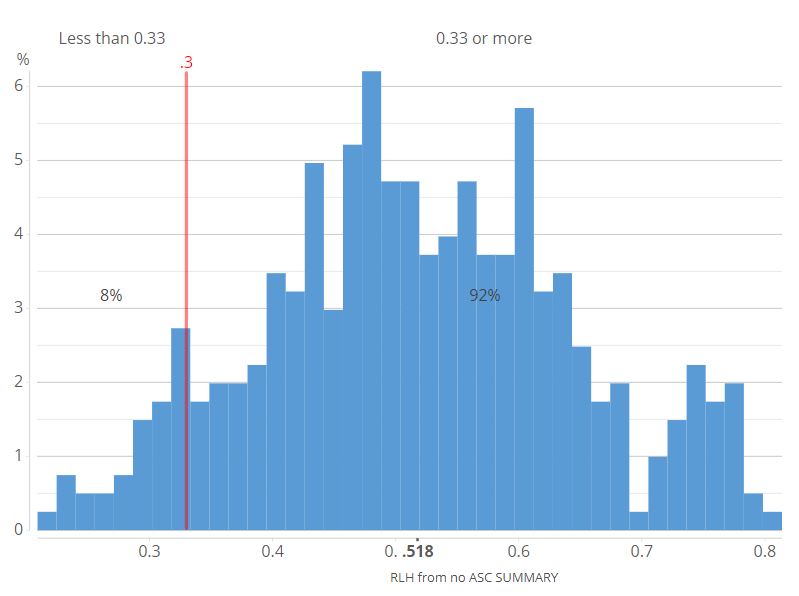 - Plot the RLH statistics for each person and determine a cutoff point, re-estimating the model using only people with RLH statistics above the cutoff value. In the chocolate study from earlier, we gave people a choice of four options, which tells us that the cutoff point needs to be at least 1/4 = 0.25. However, hierarchical Bayes models tend to overfit conjoint analysis data, so a higher cutoff is prudent. The histogram below suggests that there are a clump of people at around 0.33, which perhaps represents random choosers, but there is no easy way to be sure (if your data contains information on time taken to complete questions, this can also be taken into account).