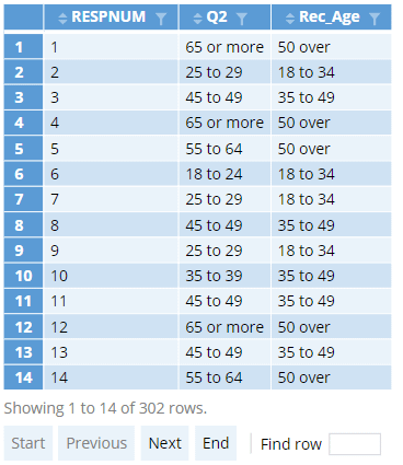To check the data, I create a raw data table showing the ID’s of the people in the sample (RESPNUM), the original age groups (Q2), and the new age groups (Rec_Age). The table would look like this: