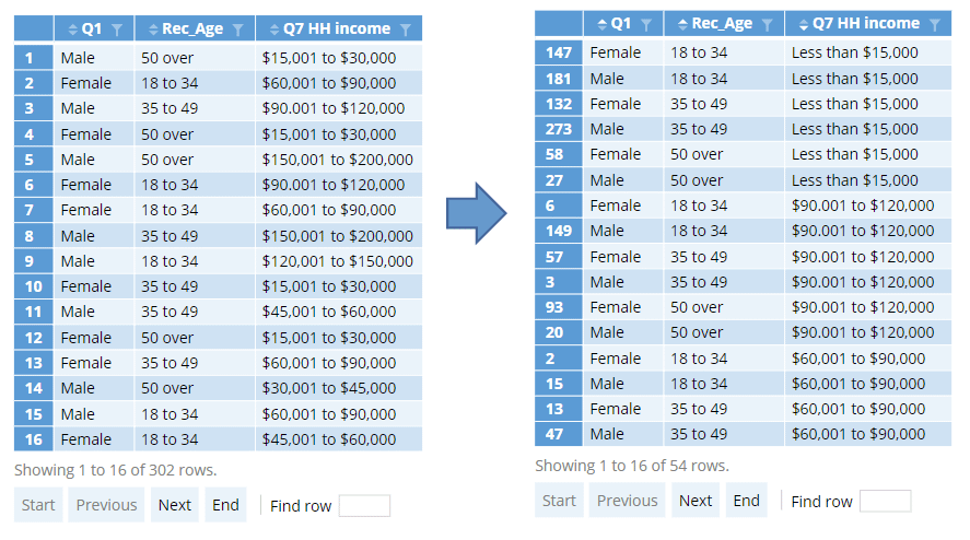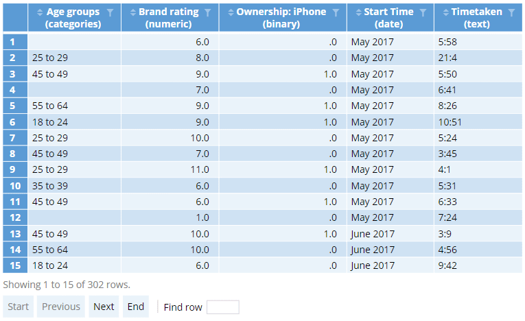 The initial output shows the raw values for all cases in the data set in the order in which they appear in the data. You can use the funnel button at the top of any column to filter the table to one or more values (just like filtering columns in an Excel table) and you can sort using the triangular arrows. If I find a mistake in the raw data, I can tell my supplier which respondent IDs are wrong and get them to correct the errors.