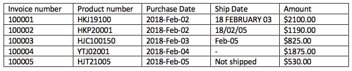 Most programs will have routines that recognize the dates in the column “Purchase date”, but the “Ship date” column with its inconsistent and less common formats will cause more difficulties. It is easy for different programs to get tripped up by these differing formats. The program reading the dates in will have to worry about things like whether the first day of the month is written “1” or “01”, whether months and days are separated by “/” or “ “, leap years, etc. Some of the most common formats include DD/MM/YYYY (e.g. 31/01/2018), DD/Mon/YYYY (e.g. 31/Jan/2018), and YYYY-MM-DD.