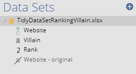 Assuming that have saved your tidy data as a spreadsheet (with nothing else in it except for three columns, as shown above), then go into Displayr, press the + Add a data set button (bottom-left of the screen), select the source and then the data file, and press OK. The Data Sets pane should then appear something like what is shown here, except that you will have different variable names.