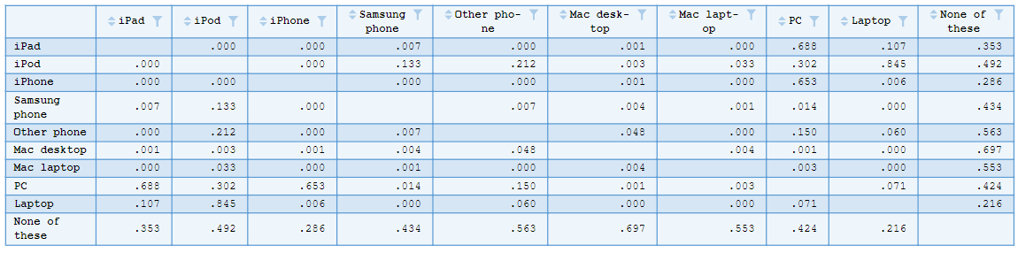 As an example, let’s look at a technology survey in which respondents were asked which devices they owned. I want to examine if there is a relationship between any of the devices owned by running a correlation matrix for the device ownership variables. To do this in R, I first load the data into the session using the read.csv function: