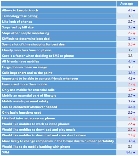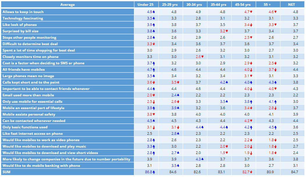 There are basically two types of sorting. Firstly you can sort the rows or columns according to the average score in each. Doing so allows you to create a ranking of sorts. If I sort the rows according to the row averages, I get the highest-ranking options at the top. All the top options have to do with using phones for social purposes.