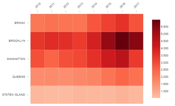 My heatmap looks like the one just below. It’s easy to work out that Brooklyn hit “peak rat” in 2016,