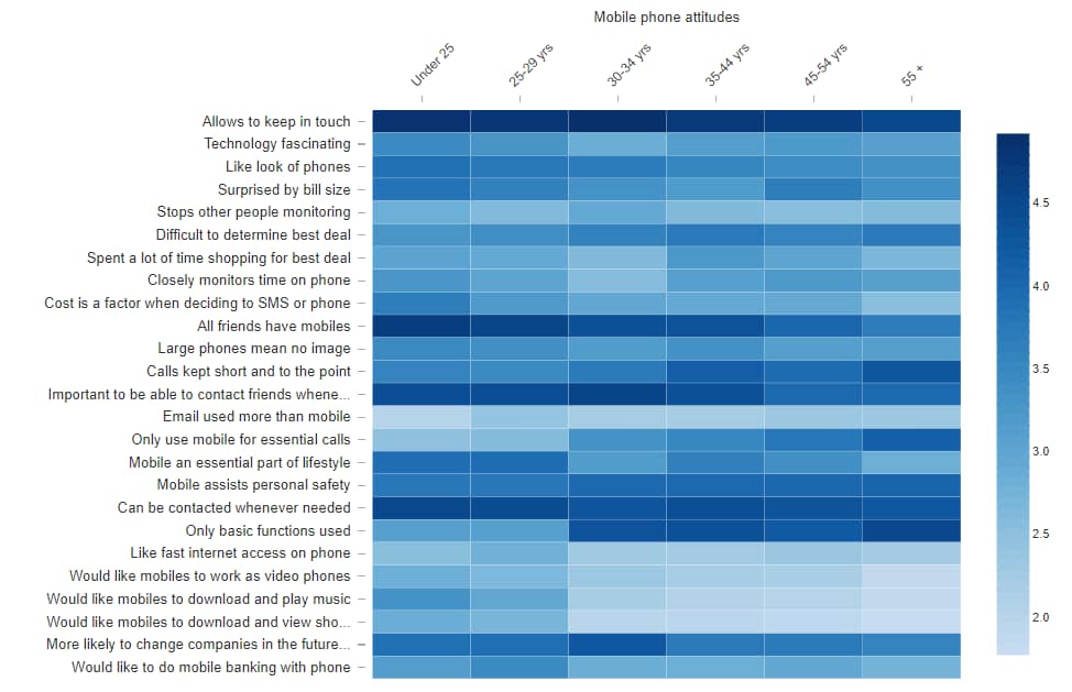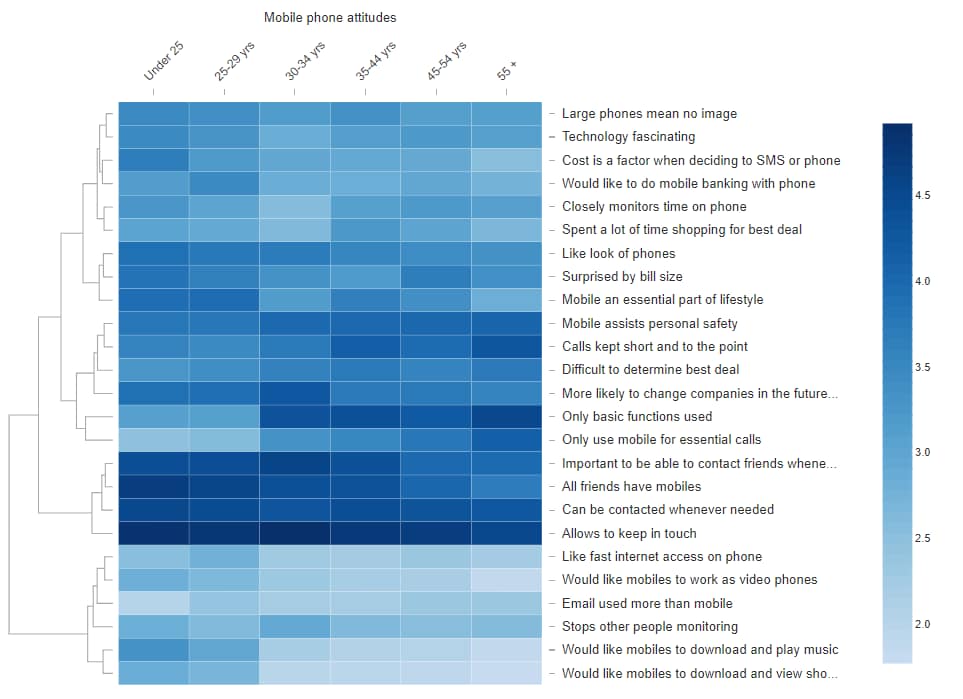 The term dendrogram refers to the tree diagram that is shown on the left side of the heatmap. The tree is used to illustrate the groupings that have been found. In this example, the rows grouped together in the bottom six correspond to attitudes which have a low score overall. They all relate to technological applications of mobile phones. The next four rows up correspond to the social applications of phones which we saw earlier, which tended to be high across all ages. The next two rows up correspond to attitudes of people who view phones as being a tool for basic functions and making essential calls. These tended to have a higher score in the older groups. Patterns in the rest of the table are less obvious in this particular example.